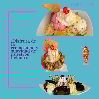 En Flor de Loto encontraras: Variedad de Helados, Malteadas, Piña Colada, Brownie, Ensaladas de Frutas, Obleas, Limonadas, Jugos Naturales, Milo frio, Copas, Perros Calientes y muchas delicias mas...
