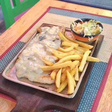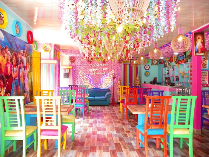 El restaurante está ubicado frente al parque principal, lo que le da un ambiente tranquilo y acogedor. Su interior está decorado con elementos que le dan un toque de encanto.